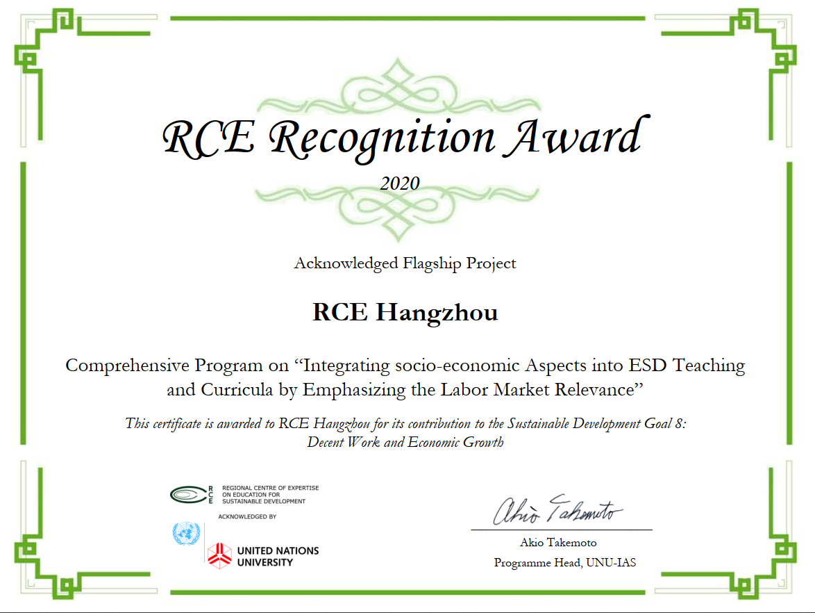 据悉,该奖项是联合国大学表彰全球各地RCE项目的年度奖项,也是继RCE杭州获得“2019年RCE杰出项目”称号后,第二次获得由联合国大学颁发的奖项。