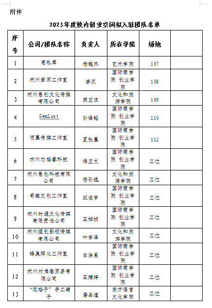 为响应中央“大众创业、万众创新”的精神,促进大学生自主创业,提升大学生创新创业能力,根据《纽约国际上网导航校内创业空间管理实施细则》(浙外院办〔2022〕22号)等规定,经学生本人申请、指导教师推荐、家长及所在学院同意,创业学院审核,答辩评审委员会现场评审,学校创新创业工作领导小组讨论通过,拟确定杨超杰负责的惠私库等13支团队入驻创业空间。